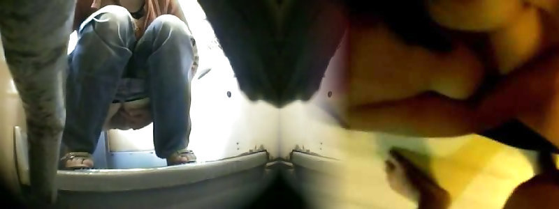 A new female dressed in denim is pissing in the douche