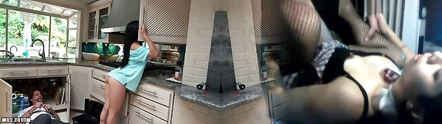 Black-haired hotty called Cindy Starfall getting it in the kitchen