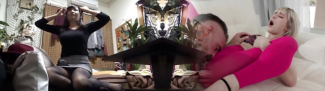 I want to play with her black pantyhose legs adorned with lotion! Four