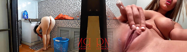 Nudist housekeeper Regina Noir drains in laundry room. 1