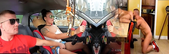 On vacation with pornographic star Vina Sky suspending at the beach and playing with her vulva in the car