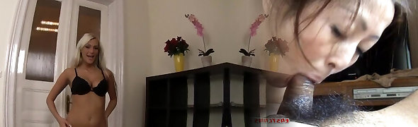 Blonde slut gives BJ while Chinese slut gets fingered