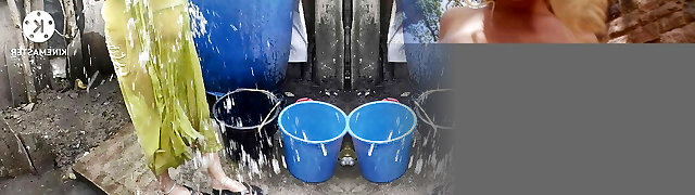 Indian Desi Bhabhi Outside Bathing wearing observe through nighty and displaying neighbor