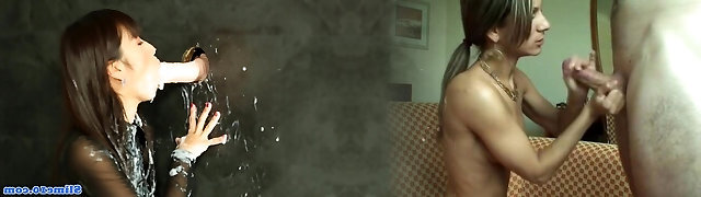 Asian bukkakke slut pussyrubbing at gloryhole