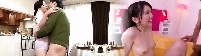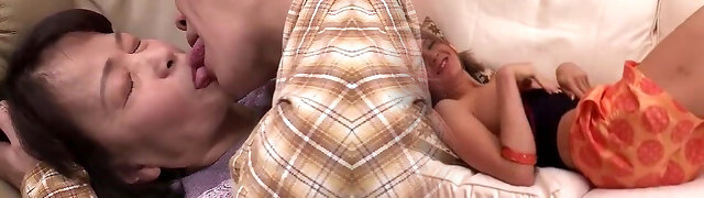 Asian Mommy and Daughter Share Sofa with Roomate and Fuck Him