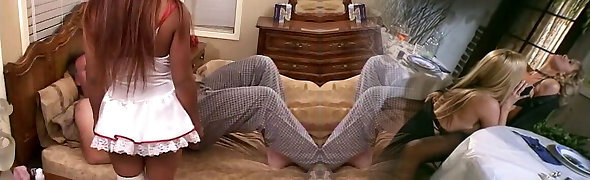 Redhead and brunette asian girls have gang threesome sex on the bed